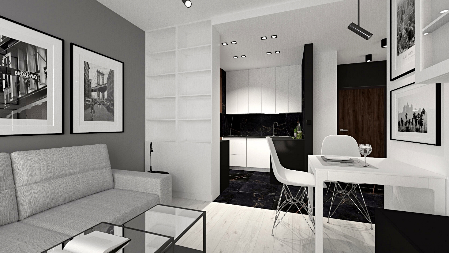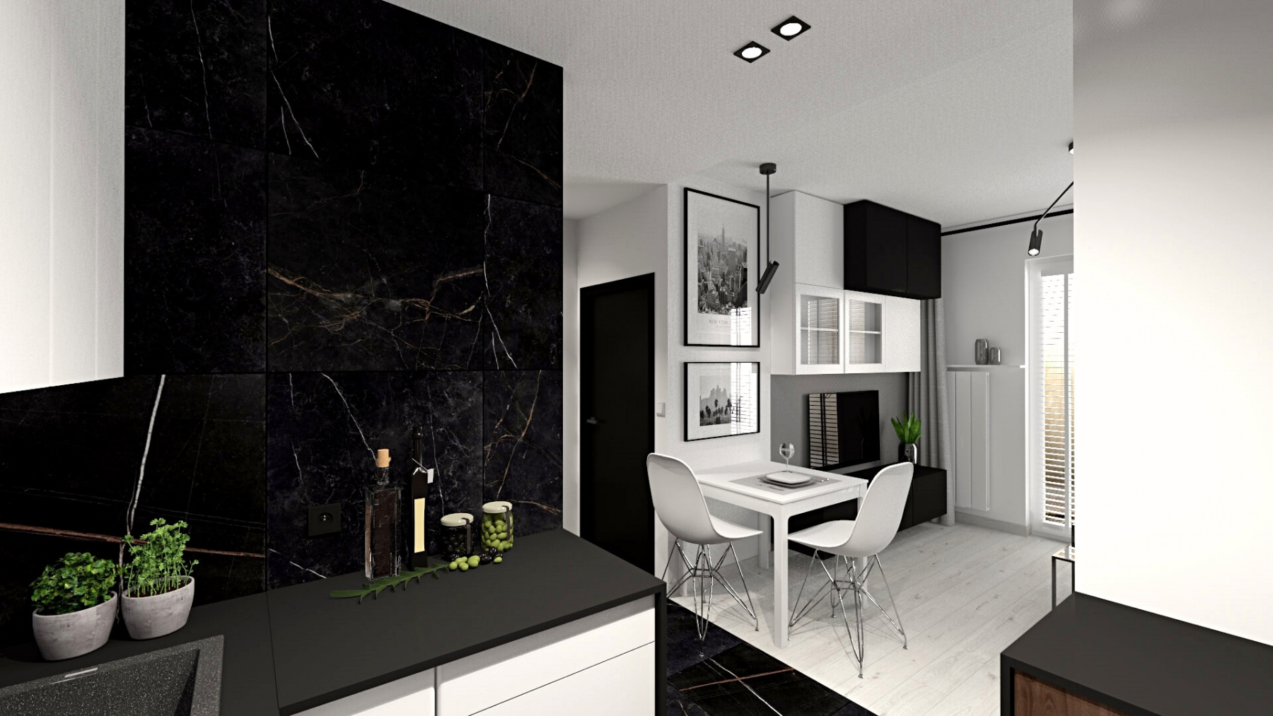 Based on the client’s needs, the interior was designed as a a game of contrasts. The strong dominance of white and black has been complemented by natural wood inserts.