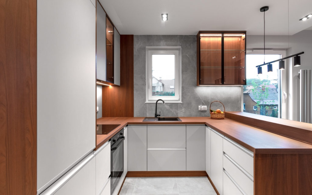 Z kolei kuchnia dwurzędowa bądź U-kształtna może okazać się najlepszym rozwiązaniem w przypadku gdy kuchnie są osobnym pomieszczeniem i mamy możliwość zagospodarowania wszystkich ścian. Taka kuchnia sprawdza się również gdy salon jest większych rozmiarów. Blaty robocze po dwóch stronach kuchni są niezwykle praktyczne i ułatwiają codzienne gotowanie.