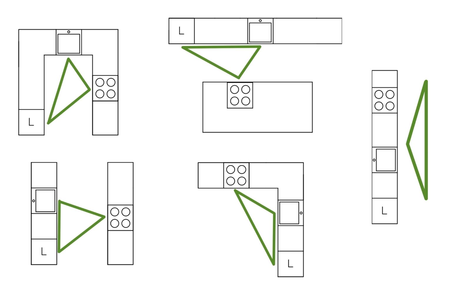 W każdym z powyższych układów możemy zastosować zasadę trójkąta roboczego, czyli odpowiednie zlokalizowanie poszczególnych mebli i urządzeń, poprawiające ergonomię pracy. Pomiędzy lodówką, zlewozmywakiem i piekarnikiem zachowane są proporcjonalne odcinki, sprawiając, że łatwiej nam funkcjonować podczas codziennych obowiązków. Wszystko, co potrzebne podczas gotowania, pieczenia czy sprzątania jest obok siebie. Przyjmuje się, że ramiona trójkąta roboczego mieszczą się w przedziale 120-210 cm (między lodówką a zlewozmywakiem i zlewozmywakiem a płytą grzewczą/piekarnikiem) oraz 120-270 cm (między lodówką a płytą grzewczą/piekarnikiem). Właśnie pomiędzy tymi odcinkami usytuowane powinno być AGD. Uwzględnienie zasady trójkąta roboczego pozwoli zaoszczędzić gotującym sporo czasu i energii. Właściwe i ergonomiczne rozplanowanie kuchni wymaga nie tylko czasu, ale przede wszystkim wiedzy i doświadczenia. Najlepiej w tej roli sprawdzają się profesjonaliści, czyli architekci, którzy znają sposoby interakcji użytkowników z wyposażeniem.
