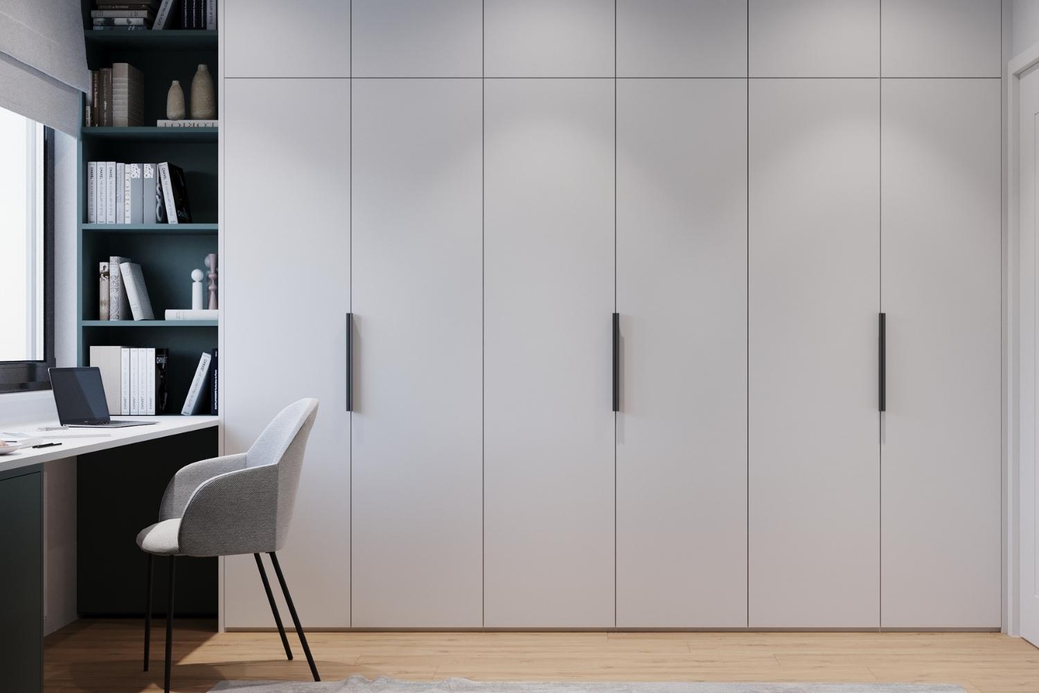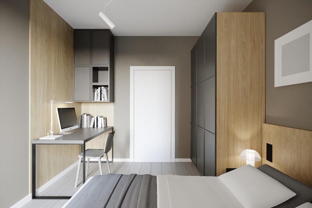 W przedstawionym poniżej projekcie wykończenia w standardzie “wchodzisz i mieszkasz” zastosowano szarą tapetę oraz regał w celu odseparowania strefy biurowej od pozostałej części pokoju. W wydzielonej przestrzeni łatwiej zorganizować miejsce na narzędzia pracy, w tym komputer, dokumenty czy telefon. W projekcie znalazło się miejsce na ergonomiczny fotel.