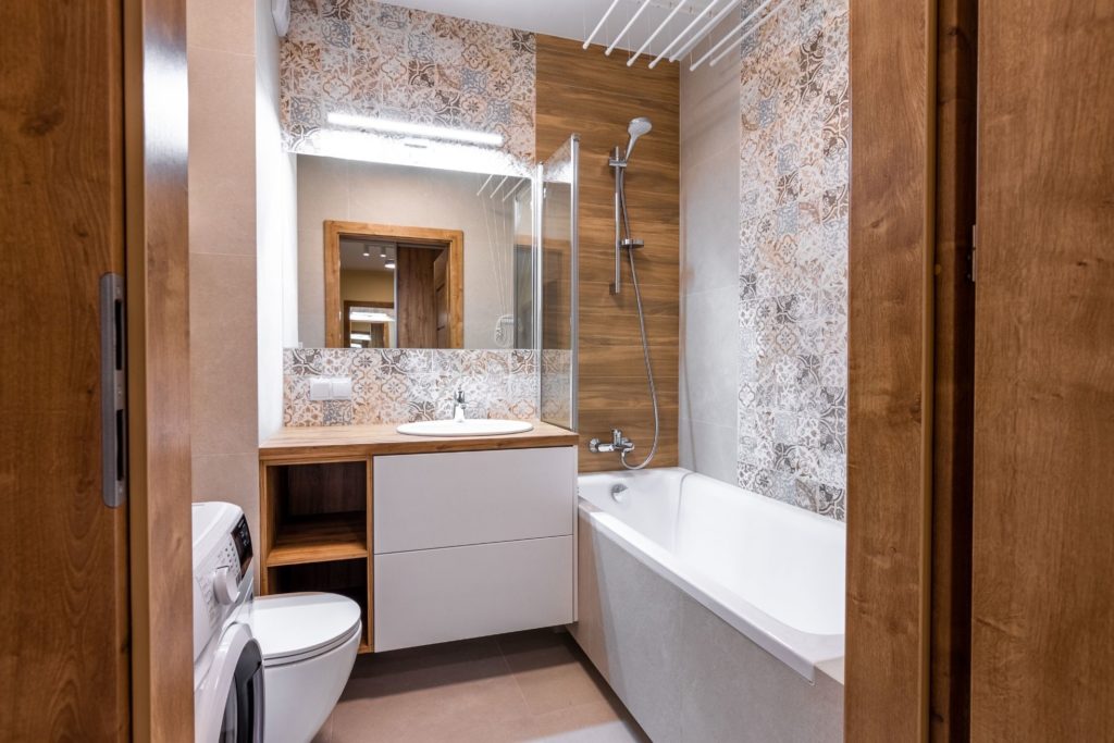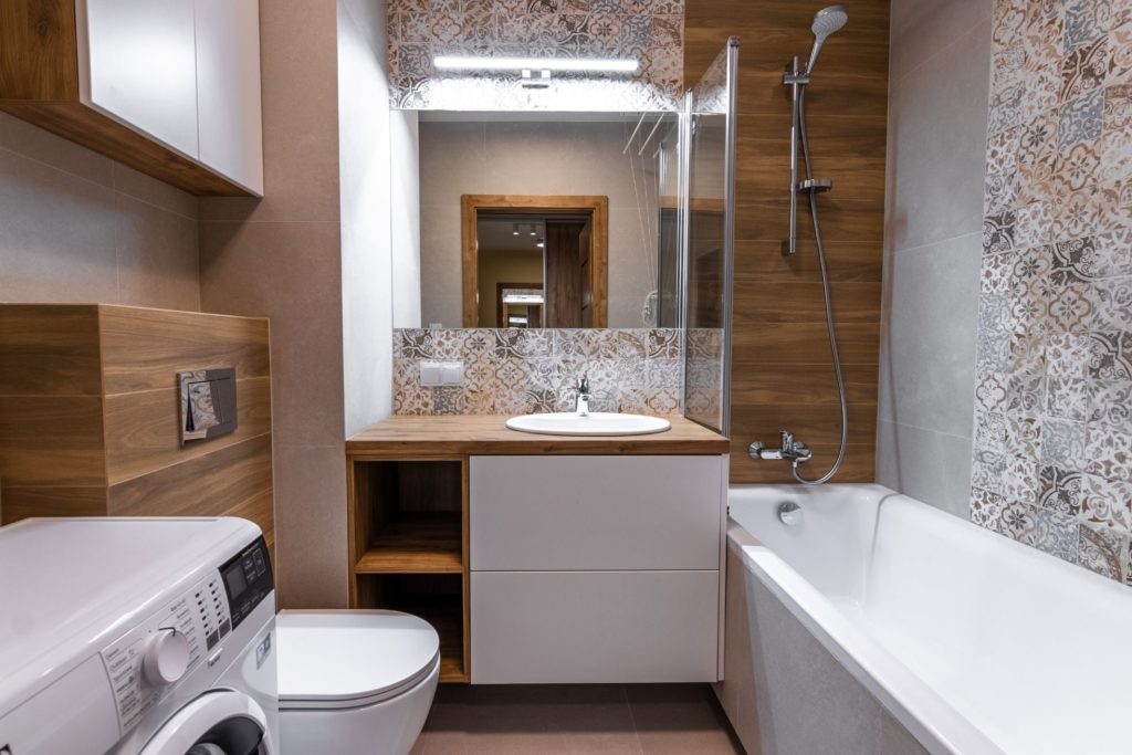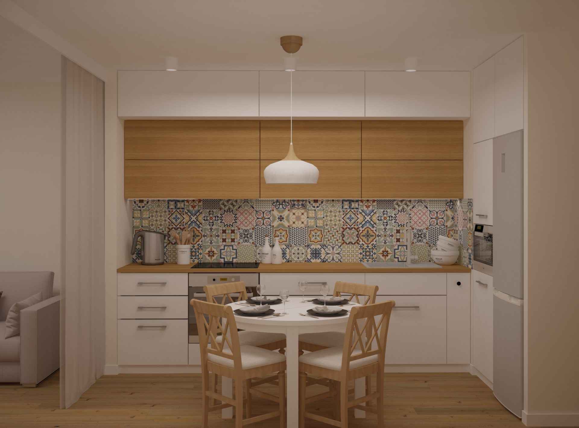 Projekt mieszkania, odwołujący się do uniwersalnej i ciepłej stylistyki, zakładał maksymalizację wykorzystania dostępnej przestrzeni. Architekt zastosował parę sprytnych rozwiązań, które mają przekładać się na komfort użytkowników: pełna zabudowa kuchni umożliwi łatwe przechowywanie produktów spożywczych; zastosowanie lustra optycznie zwiększa pomieszczenie, a zasłona pozwala w prosty sposób odseparować część kuchenną od salonu. Z uwagi na niewielką przestrzeń i ogarniczenia finansowe zdecydowano, aby nad wanną zainstalowano podwieszaną suszarkę.