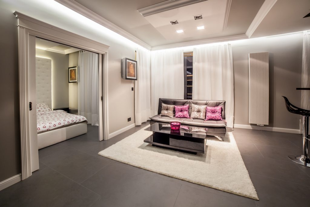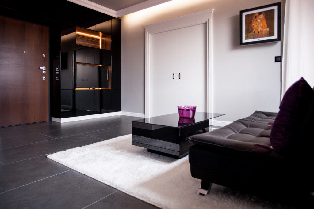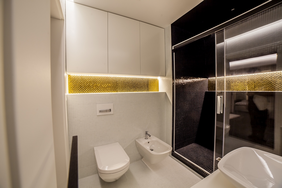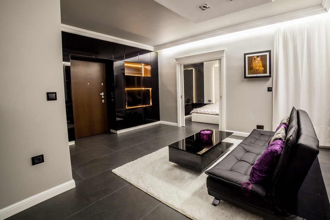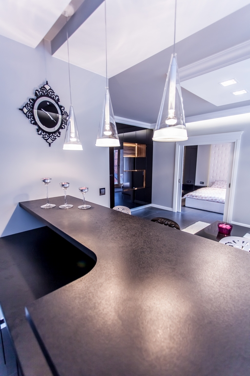 Prace nad realizacją tego apartamentu trwały 4 miesiące. Warto było czekać! Założeniem było zaprojektowanie i zrealizowanie mieszkania w wysokim standardzie, wykorzystując produkty najlepszych światowych marek. Lakierowane meble, specjalnie skonstruowane łóżko, wysokiej klasy sprzęty AGD, w tym oryginalny model klimatyzatora LG Artcool Gallery nadały temu wnętrzu elegancji i prestiżu. Dodatkowo jasna łazienka, zdobiona złotą mozaiką. Piękne lustro łazienkowe wykonał jeden z najlepszych krakowskich projektantów jako pojedynczy, autorki egzemplarz. Armatura łazienkowa znanych marek: Villeroy&Boch, Huppe oraz Hansgrohe Axor. Są to produkty, które zachwycają wysoką klasą i jakością.