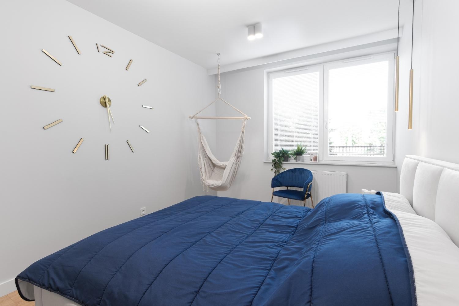 Zupełnie jak w salonie, motywem przewodnim w sypialni jest szarość połączona z odcieniem granatu. Na szczególną uwagę zasługuje dodatkowe wyposażenie wypoczynkowe w postaci hamaku. To doskonałe miejsce do relaksu z ulubioną książką. W sypialni w stylu glamour nie mogło zabraknąć złotych dodatków, w tym oryginalnego ściennego zegara. Co więcej, jest to dekoracja nie tylko bardzo atrakcyjna wizualnie, ale również praktyczna.
