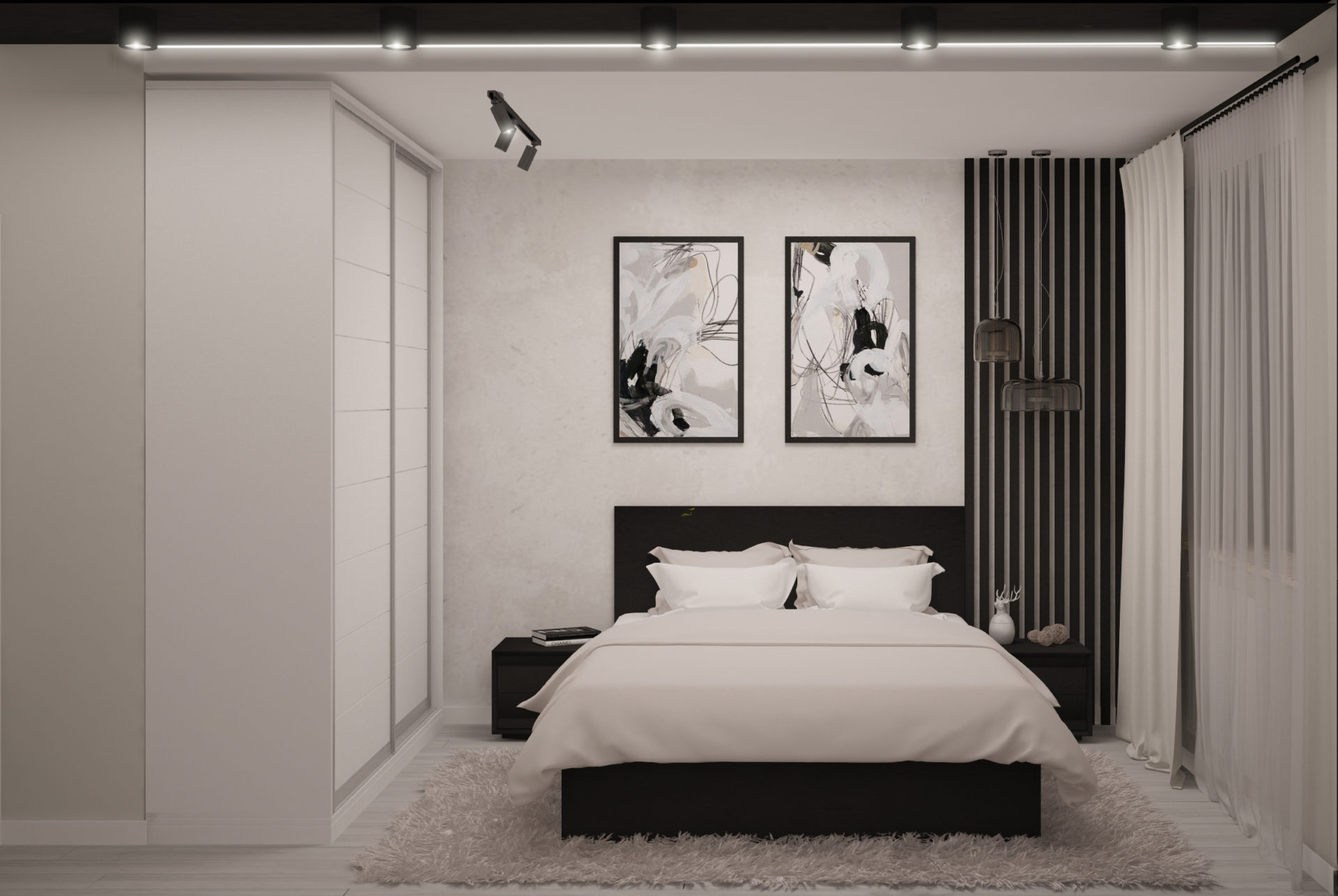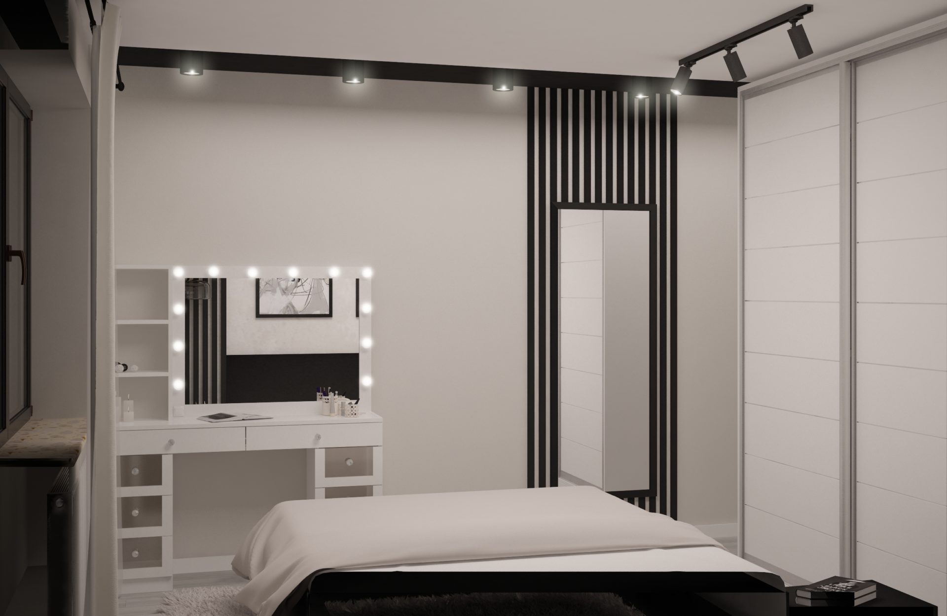 W sypialni również zastosowano lamele i meble wykonane na wymiar. Zaprojektowano toaletkę i szafę na wymiar. Oryginalnym elementem dekoracyjnym jest pomalowany na czarno sufit w miejscach, gdzie nie zastosowano sufitów podwieszanych.