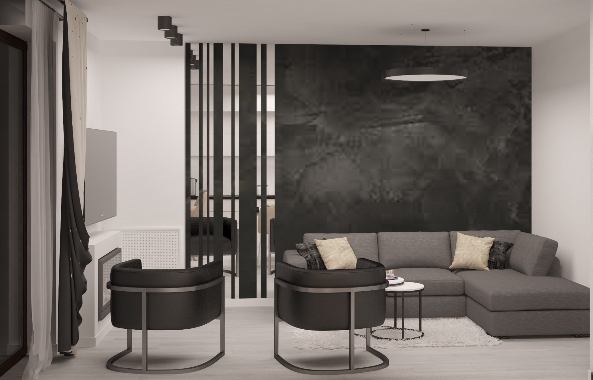 Zgodnie z wizją klienta, ścianę salonu zaprojektowano z myślą o wykończeniu czarnym tynkiem dekoracyjnym w stylu weneckim, uzupełnionym o lustrzane listwy.