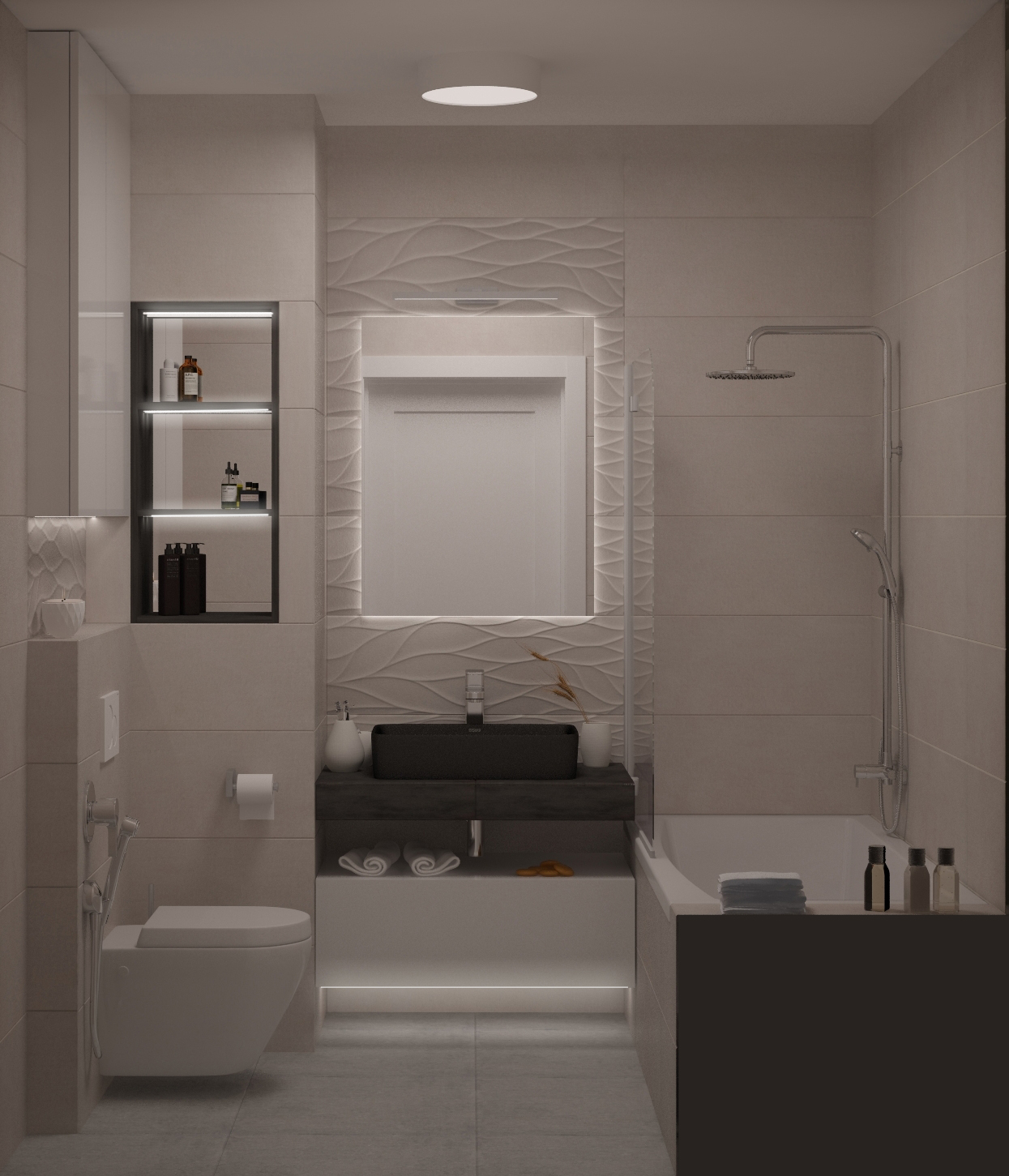Meble łazienkowe zaprojektowano z myślą o elegancji i ergonomii. Szafki pod umywalką i nad stelażem uzupełniono w listwy LED. Zainstalowana wanna z hydromasażem posiada system wodno-powietrzny, dmuchawę i światłoterapię.