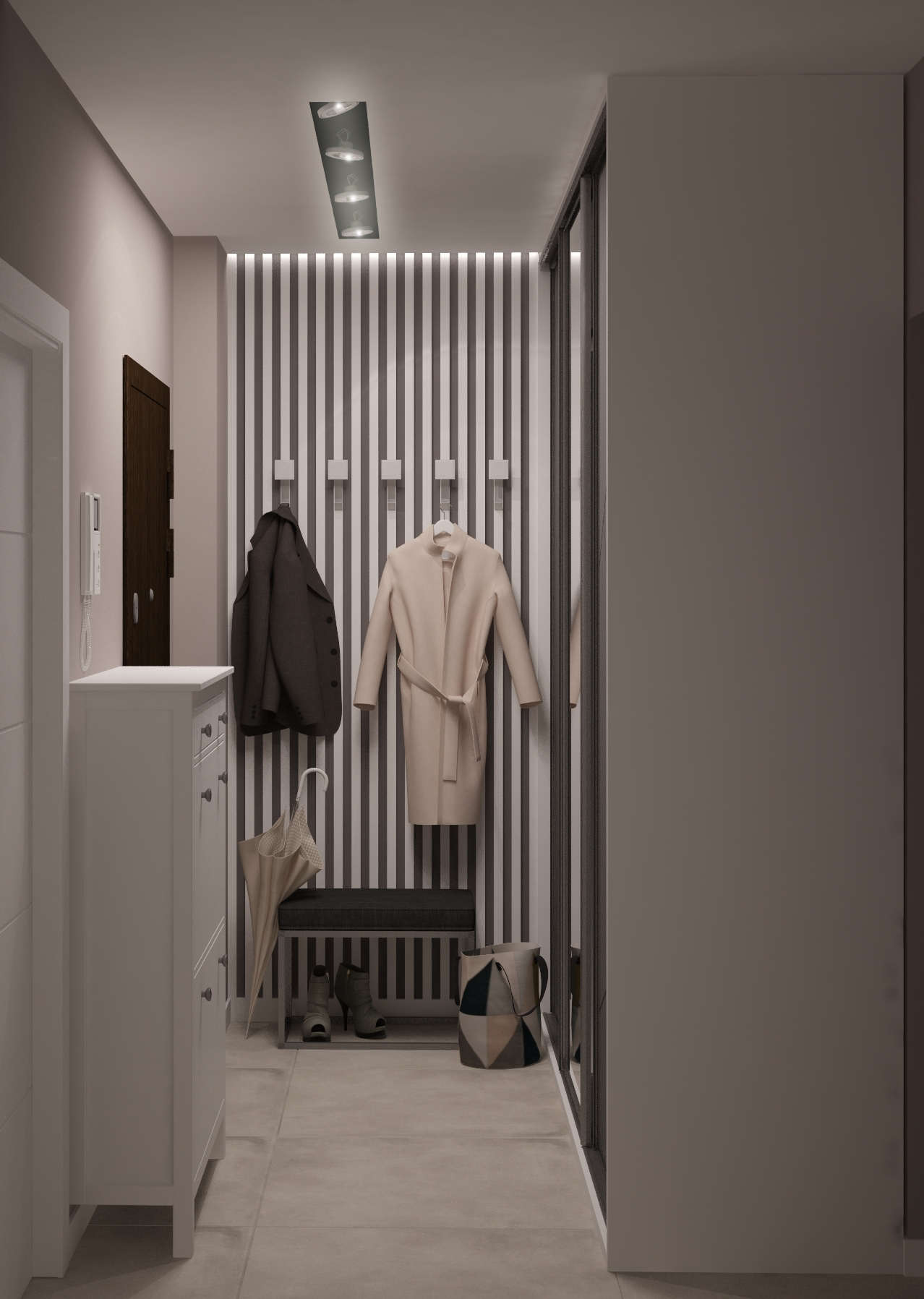 W hallu zastosowano oświetlenie chowane w sufit oraz pojemną szafę wykonywaną na wymiar zgodnie z projektem. Co więcej, zastosowanie przeszkleń, chowanego oświetlenia i lekkich lameli dekoracyjnych miało na celu optyczne zwiększenie przedpokoju.