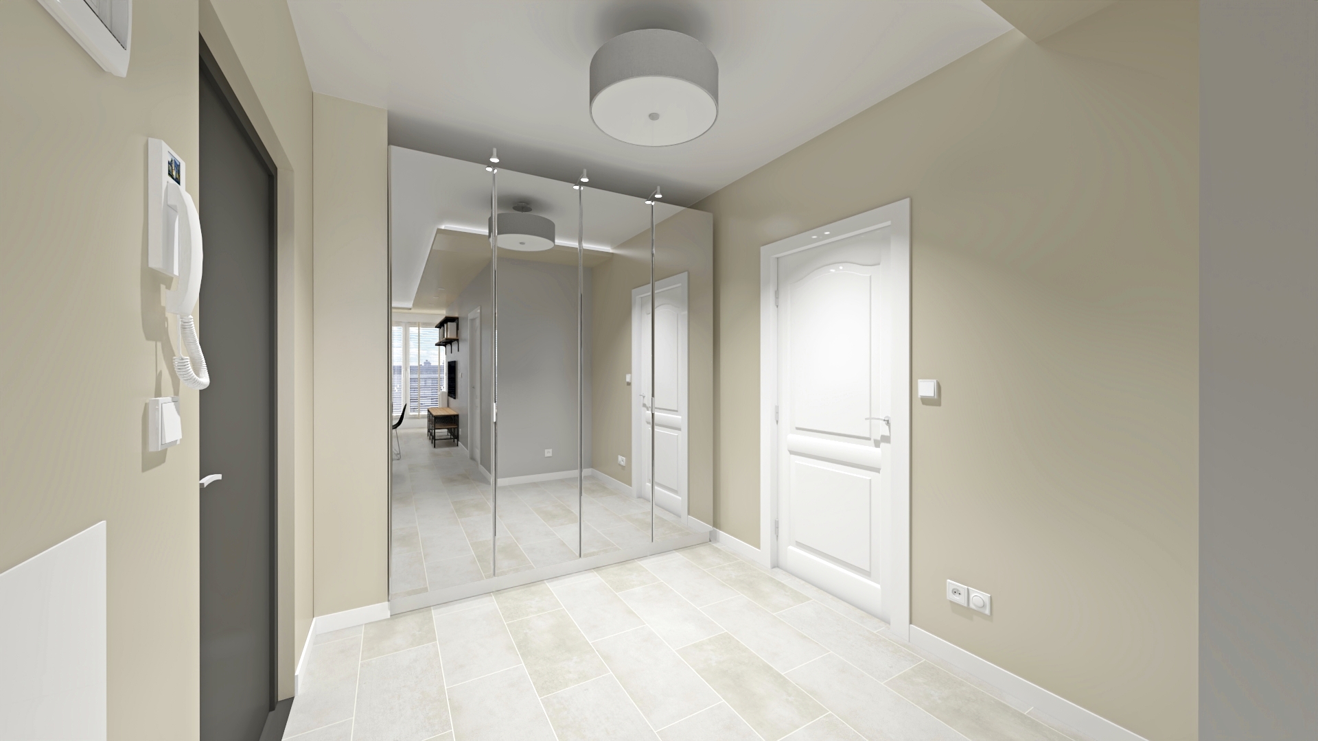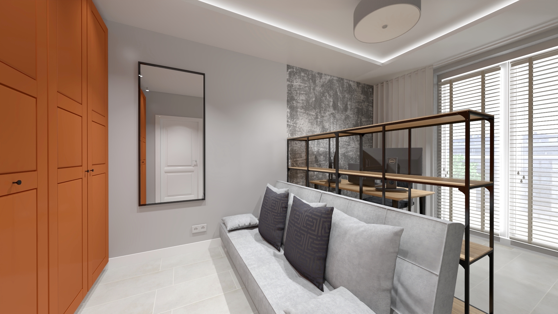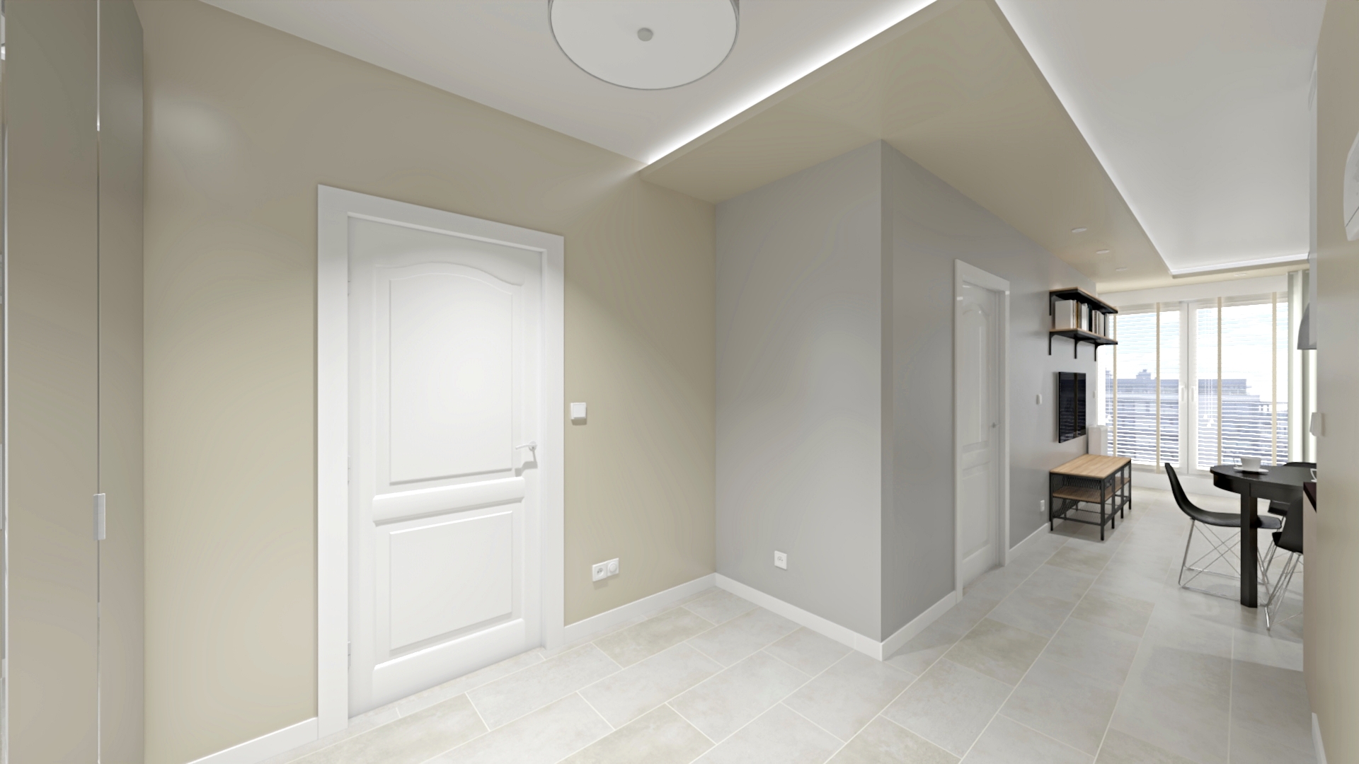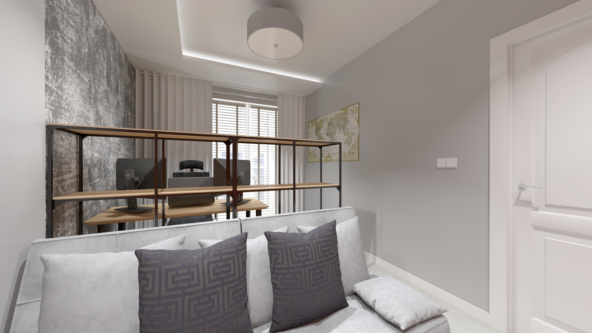 Внутренний интерьер разработан в светлом скандинавском стиле. Оригинальным элементом интерьера является контрастный модульный шкаф для одежды в кабинете. Квартира укомплектована мебелью Ikea. Застекленный шкаф в зале визуально увеличивает пространство квартиры.