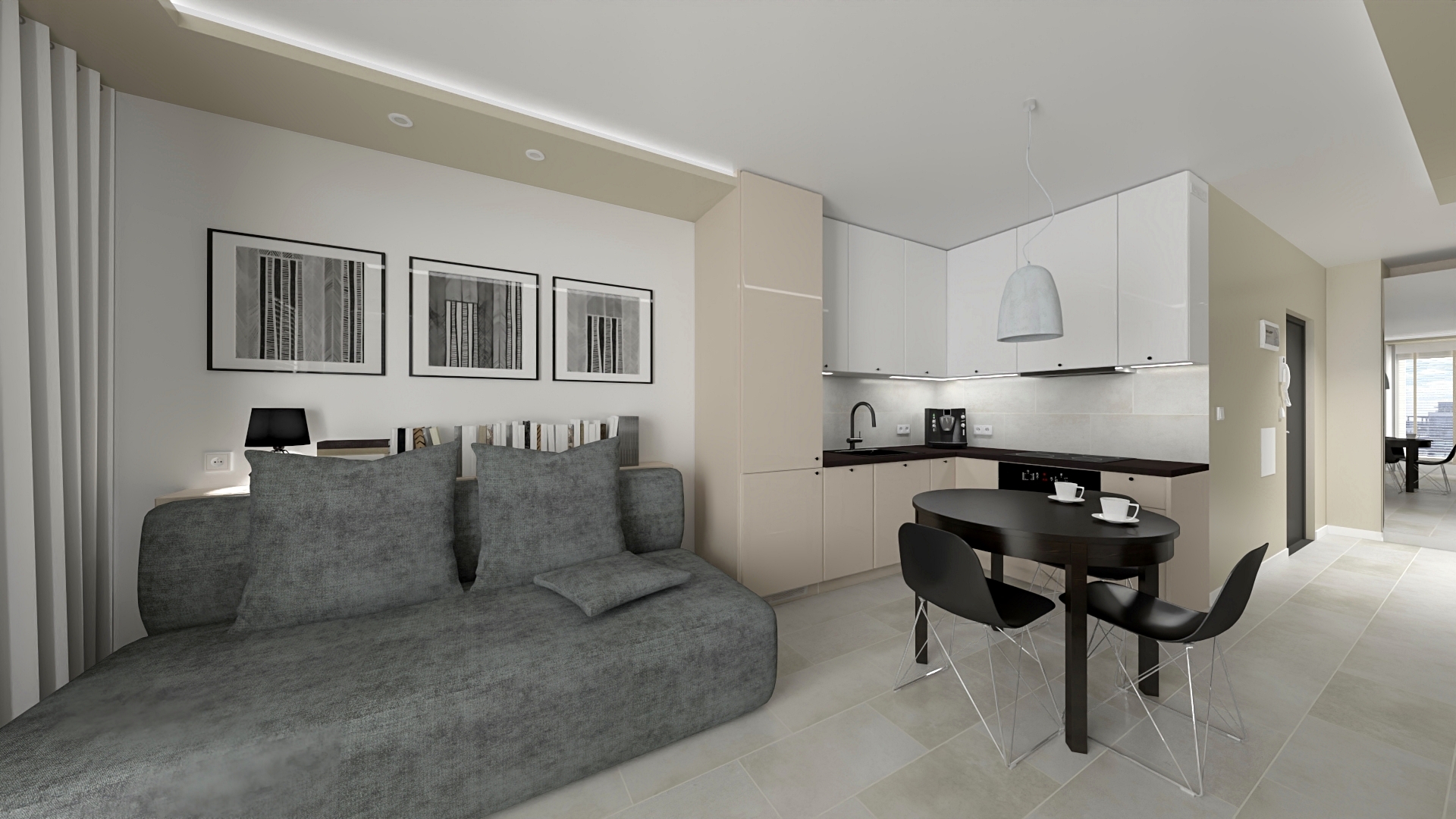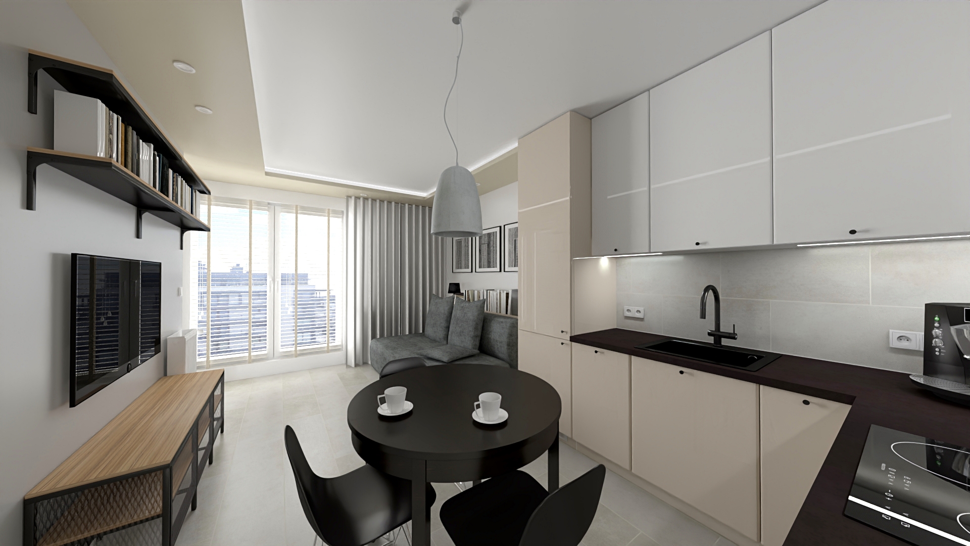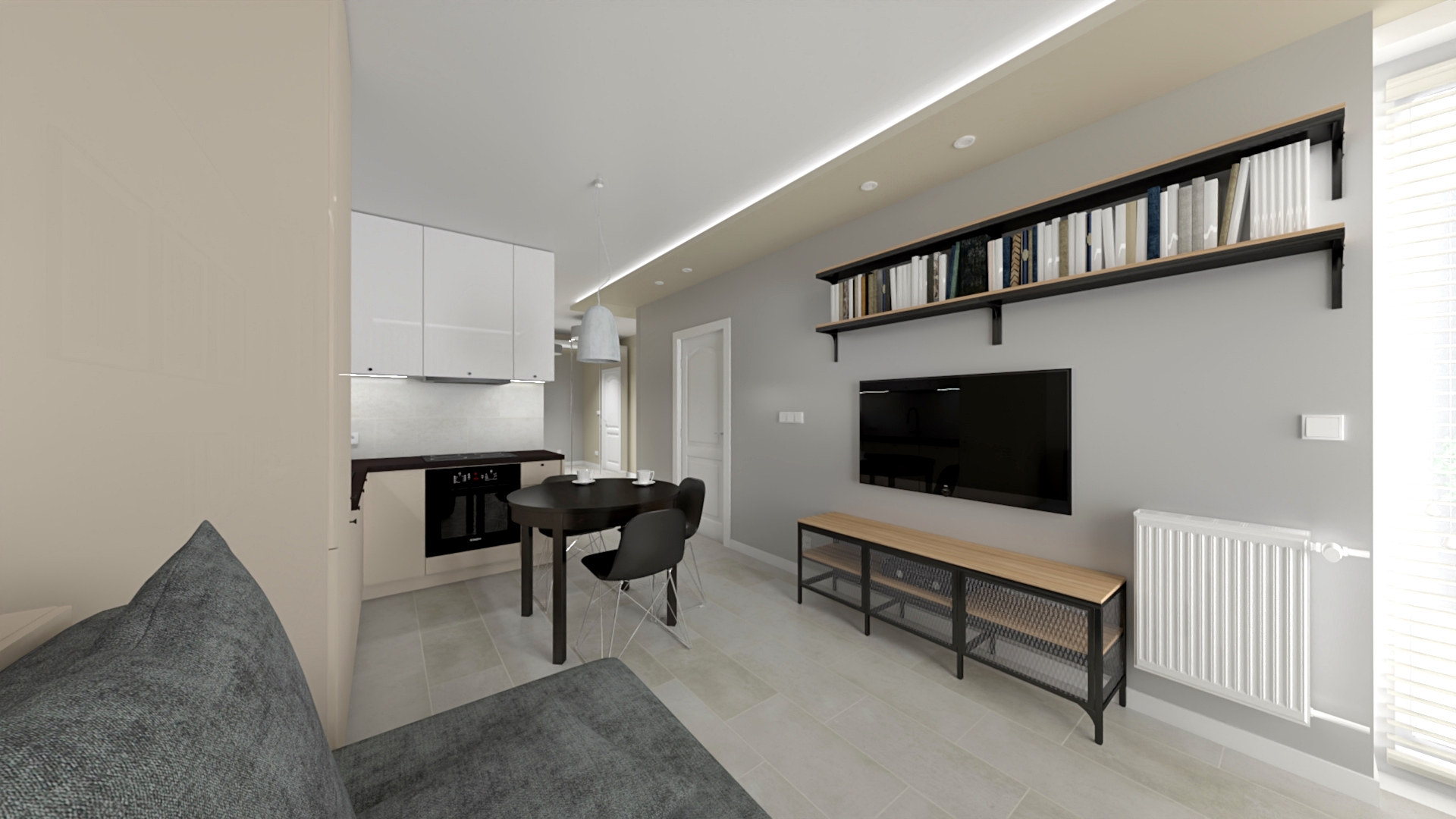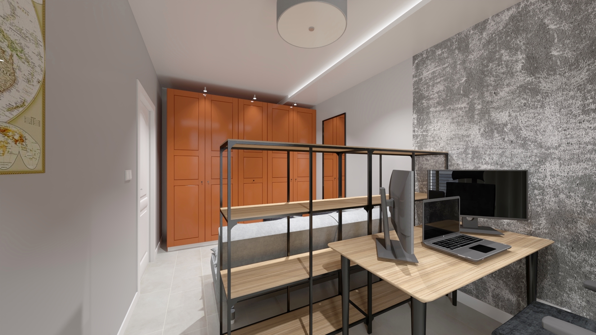 Внутренний интерьер разработан в светлом скандинавском стиле. Оригинальным элементом интерьера является контрастный модульный шкаф для одежды в кабинете. Квартира укомплектована мебелью Ikea. Застекленный шкаф в зале визуально увеличивает пространство квартиры.