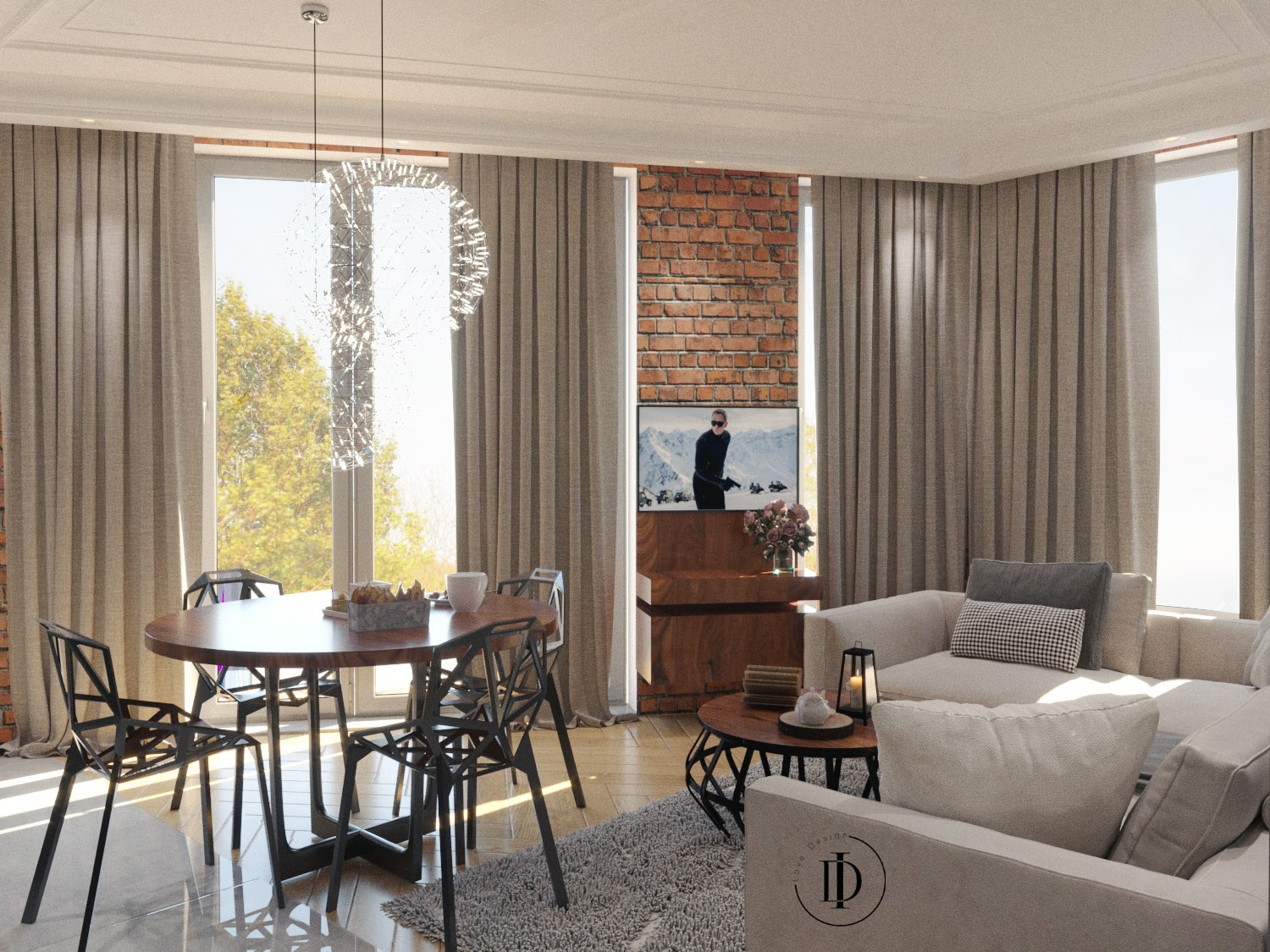 Вітальня, відразу після кухні, є серцем квартири, де ми проводимо більшу частину часу. Це може бути місце для зустрічей, вживання їжі, відпочинку або навіть дистанційної роботи. Вибране освітлення повинно відповідати багатофункціональності приміщення. Це можуть бути підвісні світильники над обіднім столом, декоративна люстра, яка служить загальним головним освітленням, а також точкове освітлення вздовж меблів, що підкреслює характер інтер’єру. Популярним аксесуаром є торшери та настінні світильники, які своїм ніжним світлом створюють делікатну, більш домашню ауру.